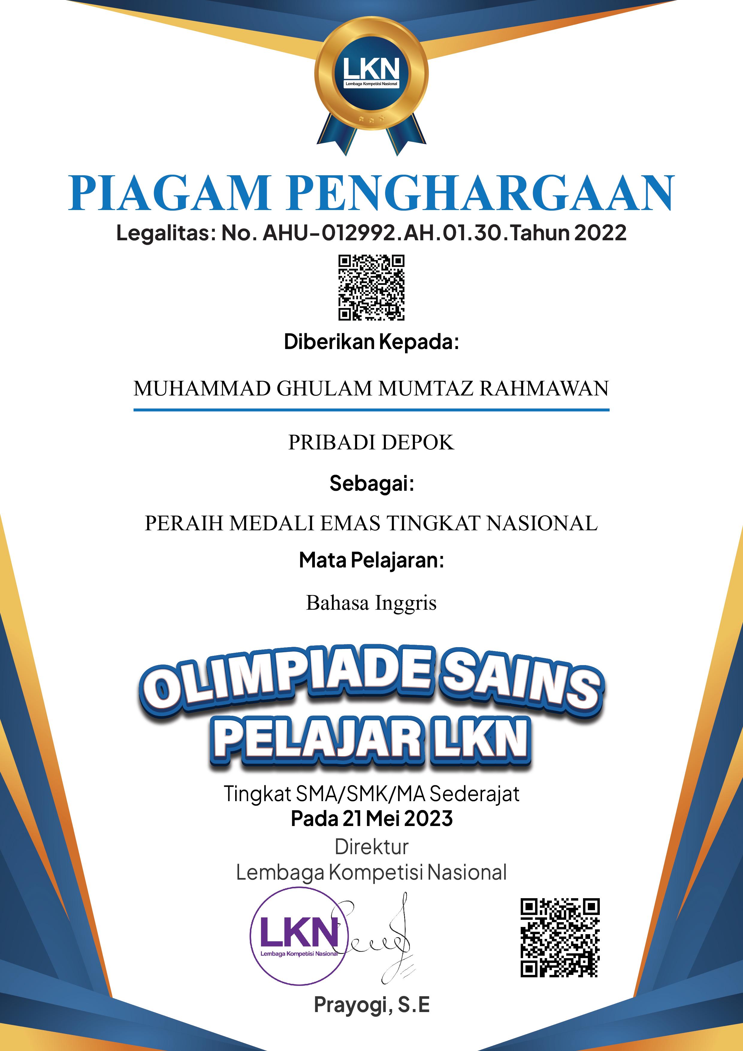 | - | Gold Medal Olimpiade Sains Pelajar LKN | Senior High | National | PT Lembaga Kompetisi Nasional |