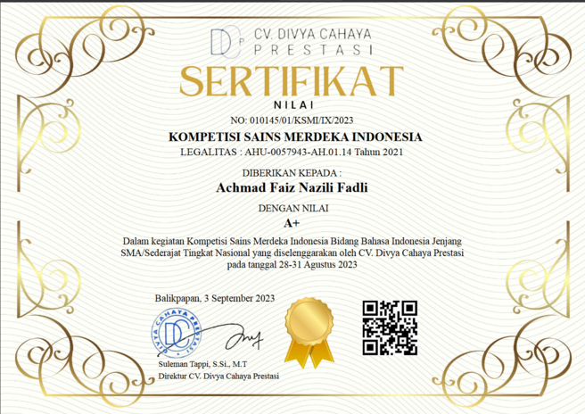| 28 August 2023 | Gold Medal NSSC Kompetisi Sains Merdeka Indonesia (KSMI) | Senior High | National | NSSC |